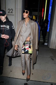 Naomi Campbell w eleganckim plaszczu i z kolorowa torebeczka