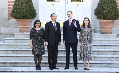 Krolowa Letizia w wezowej sukience i krol Filip przyjmuja pare prezydencka z Peru