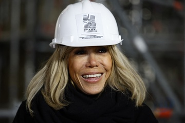 Brigitte Macron w kasku na glowie w Katedrze Notre Dame