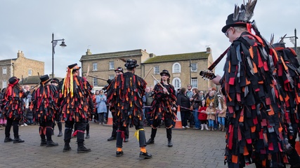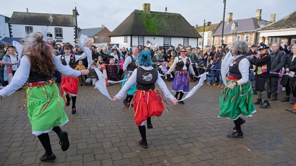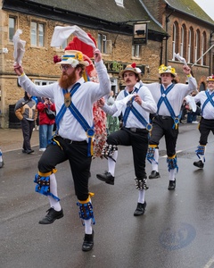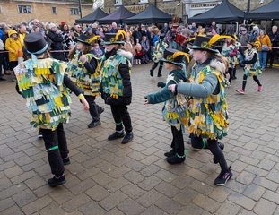 From the Cotswold's the Clausentum morris dancers perform at the Whittlesea straw bear festival,held every January in the little town of Whittlesey / Whittlesea in Cambridgeshire, near Peterborough, UK. Here a straw bear parades and dances through the str