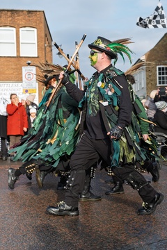 Brighton based Cuckoos nest morris dancers at Whittlesea straw bear festival,held every January in the little town of Whittlesey / Whittlesea in Cambridgeshire, near Peterborough, UK. Here a straw bear parades and dances through the streets along with var