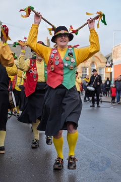 Morris dancers at Whittlesea straw bear festival,held every January in the little town of Whittlesey / Whittlesea in Cambridgeshire, near Peterborough, UK. Here a straw bear parades and dances through the streets along with various Molly / Morris dancers.