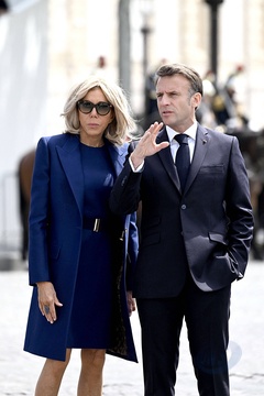 Le président Emmanuel Macron et sa femme Brigitte Macron accueillent les invités de la cérémonie internationale d'Omaha Beach dans le cadre de la commémoration du 80ème anniversaire du débarquement en Normandie (D-Day)