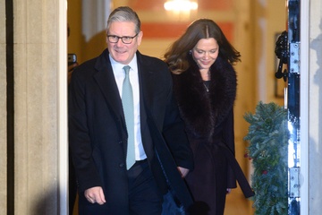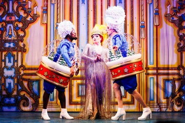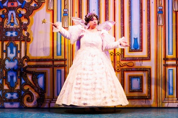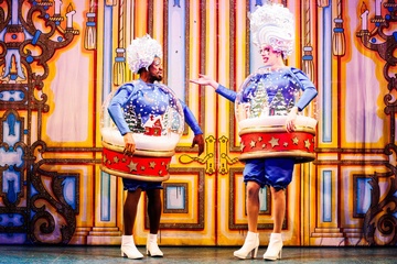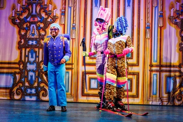 Siobhan James as Cinderella, Nicholas McLean as Buttons, Alexandra Waite-Roberts as Oblivia, the Wicked Stepmother and George Heyworth and Kat B as the Ugly Sisters Nausea and Flatula in the Cinderella Panto at the Hackney Empire in London on 2 December 2