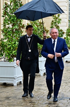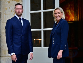 Jordan Bardella i Marine Le Pen po spotkaniu z premierem w ramach konsultacji politycznych w paryskim Hôtel de Matignon.