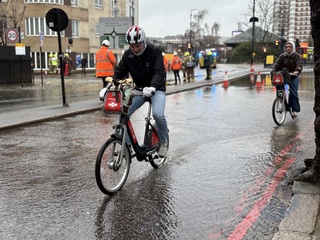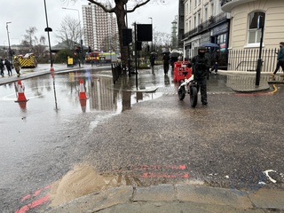 Electric bike rider navigates flooded pavement near Shepherd’s Bush, London