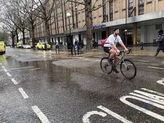 Cyclist passes flooded road near Shepherd’s Bush roundabout, London
