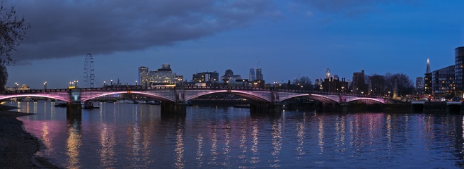 Albert bridge by Millbank at night, looking towards the London Eye and the City of London. London, UK.