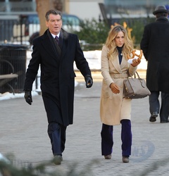 Simon Baker z zona i psem na spacerze wygladaja na zrelaksywanych