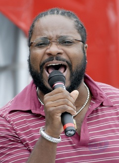 Malcolm-Jamal Warner on stage at the Celebrity Pro-Am Video Game Tournament on Hermosa Beach