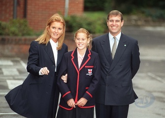 The Duke and Duchess of York's elder daughter Beatrice arrived at St. George's School in Ascot with her parents today to attend the first day at her new school. She was greeted by the headmistress, Joanna Grant Peterkin.