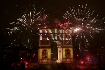 Show avec feu d’artifice, son, lumière projeté sur l'Arc de triomphe lors de l’émission "La grande soirée du 31 décembre de Paris" diffusée sur France 2 sur les Champs-Elysées à Paris