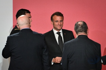 Prezydent Francji Emmanuel Macron na uroczystości wręczenia nagród rzemieślnikom i urzędnikom, którzy przyczynili się do renowacji katedry Notre-Dame w Pałacu Elizejskim w Paryżu. 86