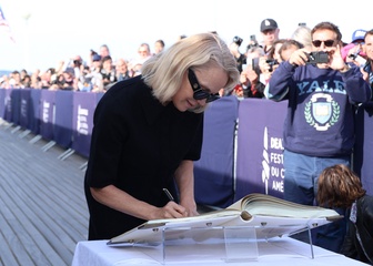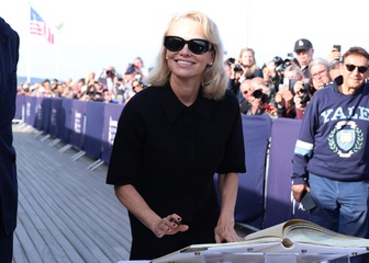 Pamela Anderson otwiera swoją kabinę na scenie w Deauville podczas 51. Deauville American Film Festival