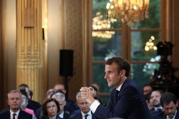 Emmanuel Macron podczas konferencji w Palacu Elizejskim