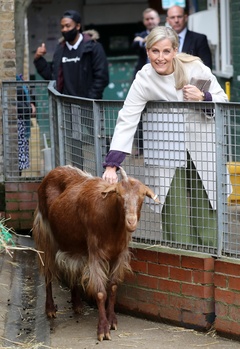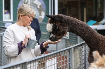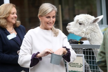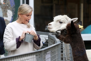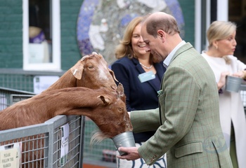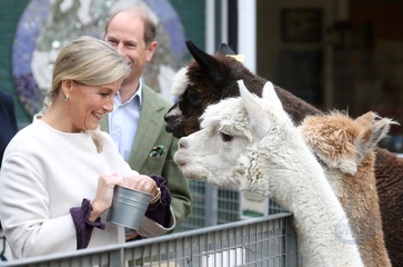 Ksiaze Edward i hrabina Sophie karmia lamy i kroliki na farmie