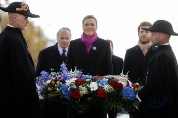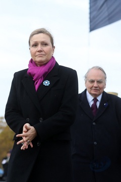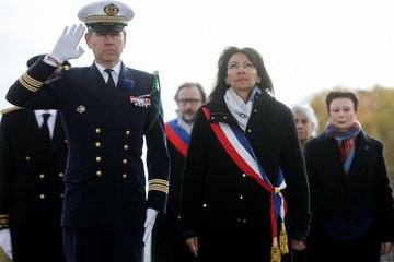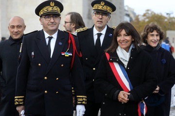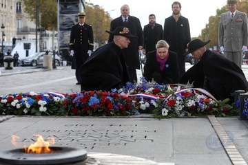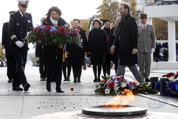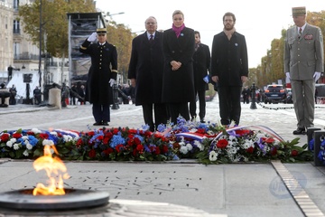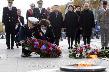 Le président Emmanuel Macron participe à la cérémonie de dépôt de gerbe et du ravivage de la flamme de la Tombe du Soldat inconnu à l'Arc de Triomphe lors de la cérémonie du 105ème anniversaire de l'Armistice de 1918