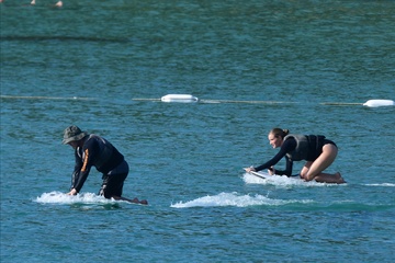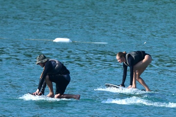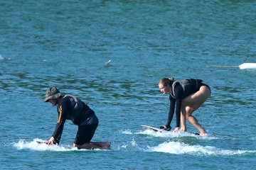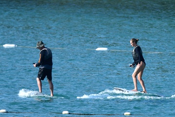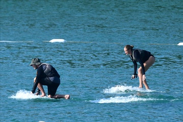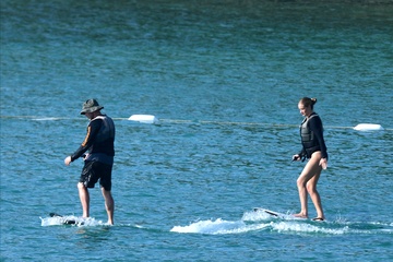 Exclusif - Prix spécial - No Web - Exclusif - Prix spécial - No Web - Jason Statham et sa compagne Rosie Huntington-Whiteley s'essaient à la planche volante ou foil électrique lors de leurs vacances à Phuket, Thaïlande