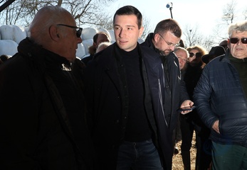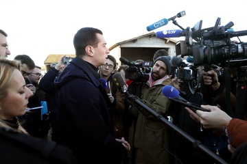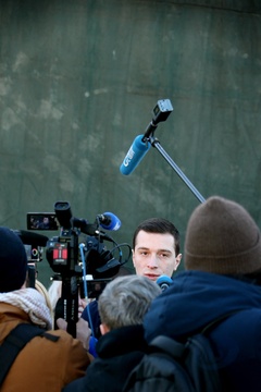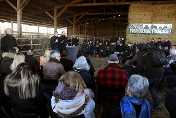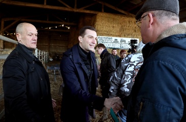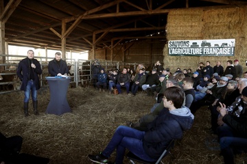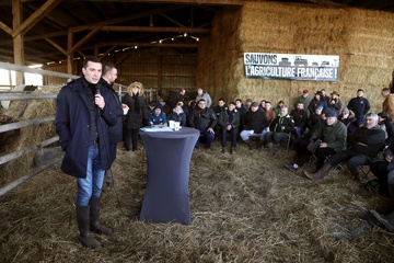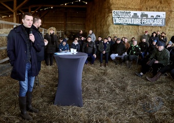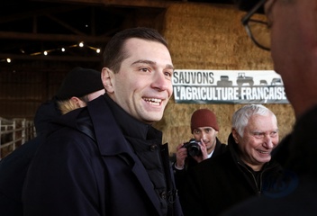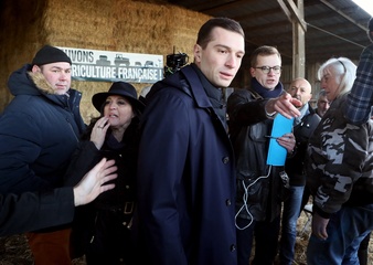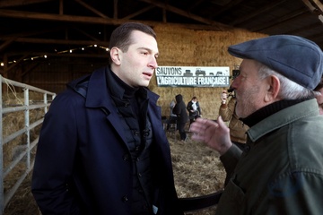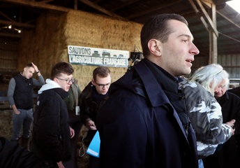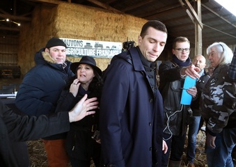 Jordan Bardella, président du Rassemblement national, en visite auprès des agriculteurs de Queyrac