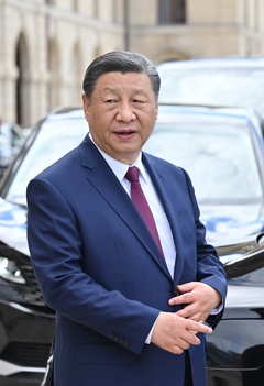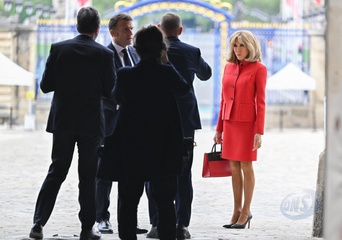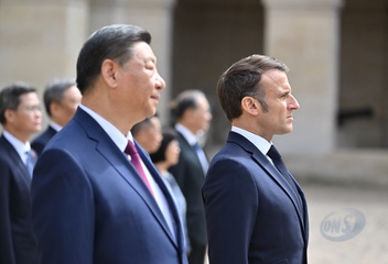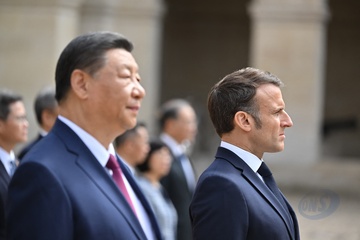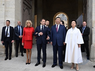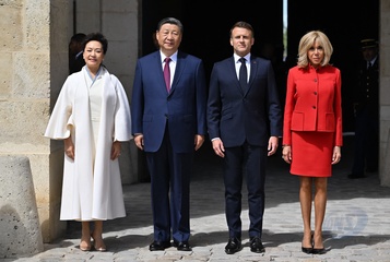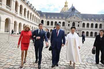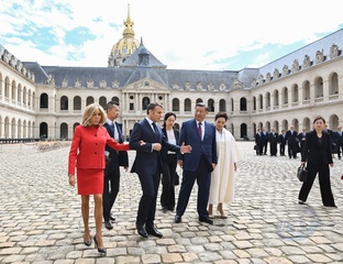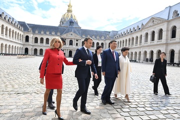 Prezydent Emmanuel Macron, Pierwsza Dama Brigitte Macron, Prezydent Xi Jinping i Pierwsza Dama Peng Liyuan podczas oficjalnej ceremonii powitania w Hôtel National des Invalides w Paryżu 82