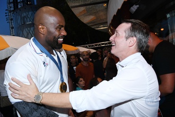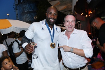 Teddy Riner świętuje swój tytuł mistrza olimpijskiego w judo +100 kg w należącej do grupy restauracji „Podium” (Les bistrots Pas Parisiens) w Paryżu. 75