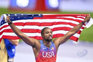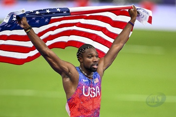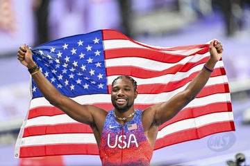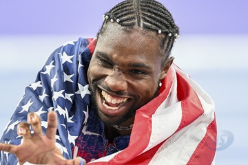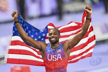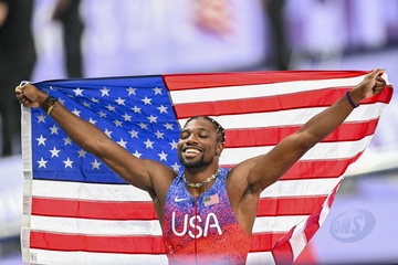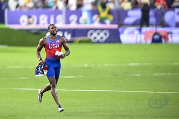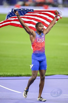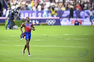 Gwiazdy na finale biegu na 100 m mężczyzn na Stade de France podczas Igrzysk Olimpijskich w Paryżu w 2024 r.