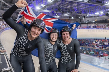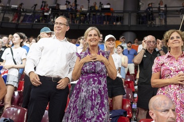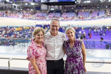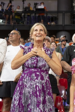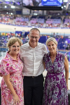 Księżna Sophie z Edynburga patrzy, jak Brytyjki wygrywają finał sprintu drużynowego kobiet w kolarstwie lekkoatletycznym podczas Igrzysk Olimpijskich 2024 w Paryżu (OG) na torze Vélodrome National w Saint-Quentin-en-Yvelines 71