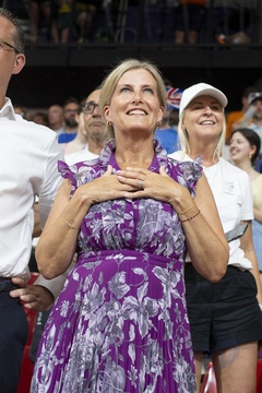 La duchesse Sophie d'Edimbourg assiste à la victoire des britanniques à la finale du sprint par équipes féminin sur piste en cyclisme lors des Jeux Olympiques (JO) de Paris 2024 au Vélodrome National à Saint-Quentin-en-Yvelines