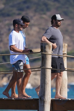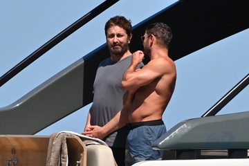 Exclusif - Gerard Butler, 54 ans, sa nouvelle compagne Penny Lane, 29 ans, et Zac Efron, 36 ans, en vacances sur un yacht dans le Golfe de Saint-Tropez, Cote d'Azur, 92