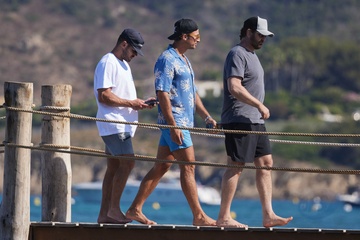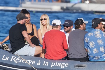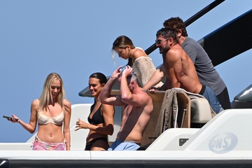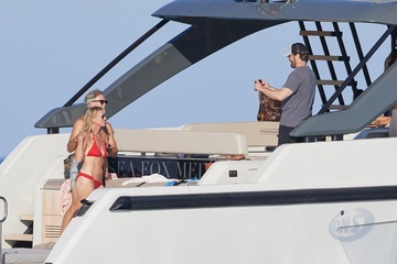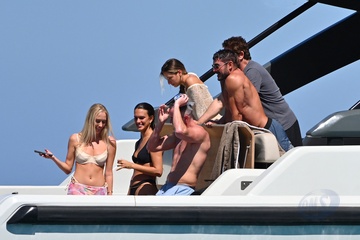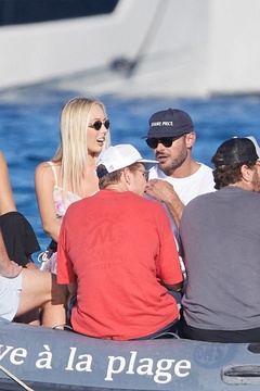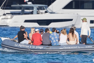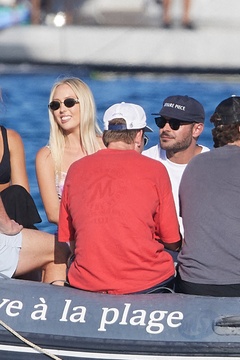 Exclusif - Gerard Butler, 54 ans, sa nouvelle compagne Penny Lane, 29 ans, et Zac Efron, 36 ans, en vacances sur un yacht dans le Golfe de Saint-Tropez, Cote d'Azur,