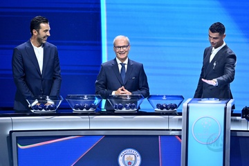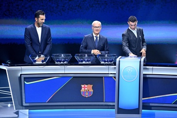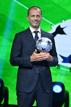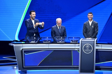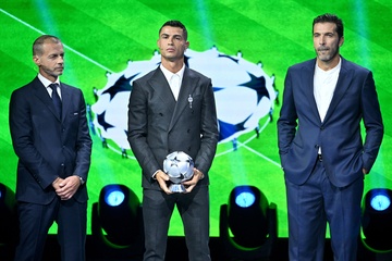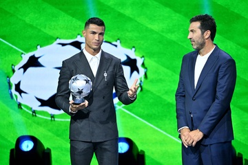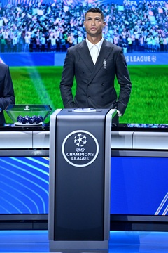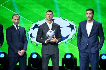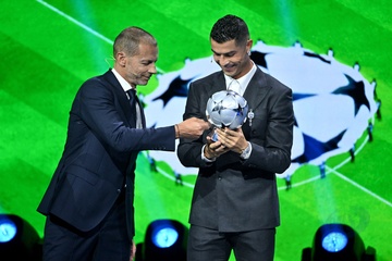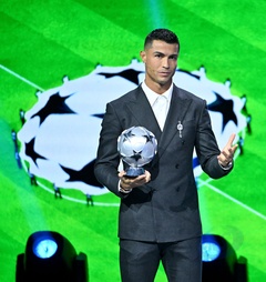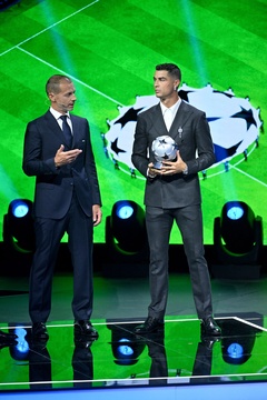 Cristiano Ronaldo reçoit le prix de meilleur buteur de tous les temps lors du tirage au sort UEFA pour la saison 2024/2025 au forum Grimaldi à Monaco