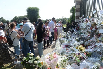Kwiaty i wiadomości pozostawione przez fanów przed posiadłością Alaina Delona na kilka godzin przed pogrzebem aktora, który odbędzie się w kaplicy na jego posiadłości.