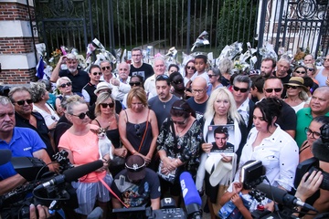 Anthony Delon i jego przyrodni brat Alain-Fabien odkrywają hołdy przed bramą posiadłości Douchy, na kilka godzin przed pogrzebem ich ojca, Alaina Delona
