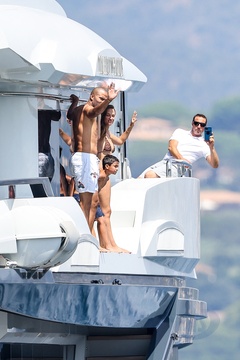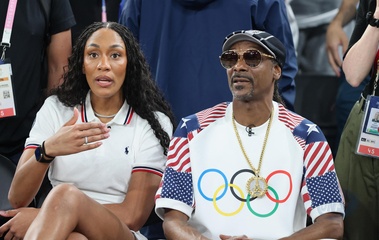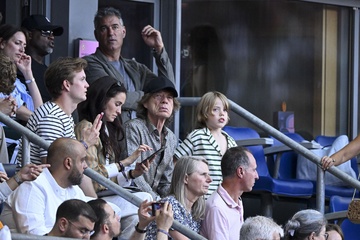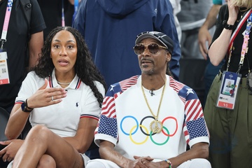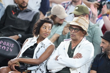 Gwiazdy na trybunach podczas półfinałowego turnieju koszykówki pomiędzy Francją a Niemcami podczas Igrzysk Olimpijskich w Paryżu w 2024 r. (OG) w Bercy Arena.