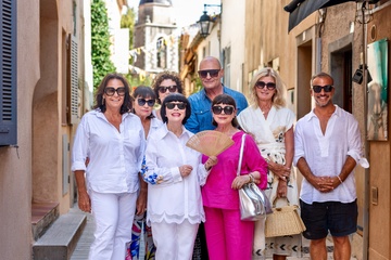 Exclusif - Mireille Mathieu, accompagnée de ses soeurs Monique et Christiane et de quelques amis, se promène dans les rues de Saint-Tropez et va se recueillir dans sa célèbre église