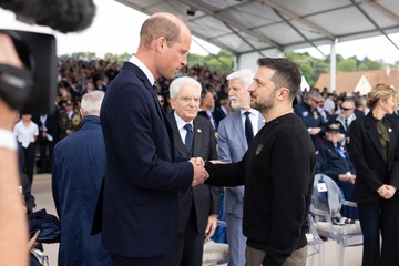 Le président Emmanuel Macron et sa femme Brigitte Macron accueillent les invités de la cérémonie internationale d'Omaha Beach dans le cadre de la commémoration du 80ème anniversaire du débarquement en Normandie (D-Day)