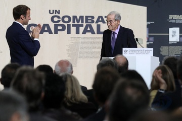 Le président de la république Emmanuel Macron et Robert Badinter durant la Commémoration du quarantième anniversaire de l'abolition de la peine de mort au Panthéon à Paris