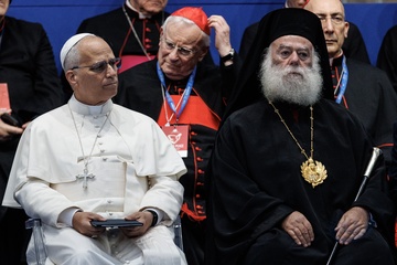 Pope Leo XIV attends an inter-religious meeting to pray for peace inside the Colosseum in Rome, Italy on 28 October 2025.