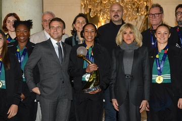 Prezydent Francji Emmanuel Macron i Pierwsza Dama Brigitte Macron przyjmują kapitana francuskiej drużyny piłki ręcznej Estelle Nze Minko i francuską drużynę piłki ręcznej kobiet, mistrzynie świata 2023