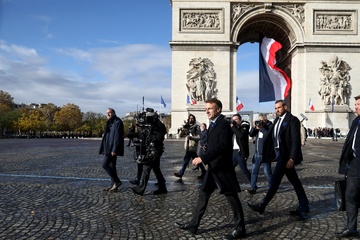 Emmanuel Macron sklada wieniec przy Grobie Nieznanego Żołnierza pod Łukiem Triumfalnym z okazji 105 rocznicy zawieszenia broni w 1918 r.