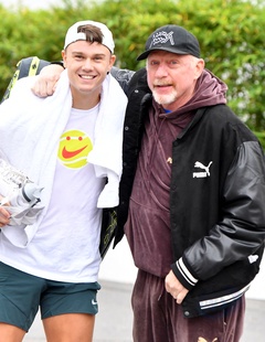 Holger Rune et son entraîneur Boris Becker avant le quart de finale l'opposant à Novak Djokovic lors de l'Open Rolex Paris Masters