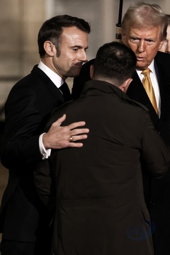 Prezydent Francji Emmanuel Macron przyjmuje swoich amerykańskich odpowiedników Donalda Trumpa i Ukraińca Wołodymyra Zełenskiego w Pałacu Prezydenckim Elizejskim w Paryżu 25