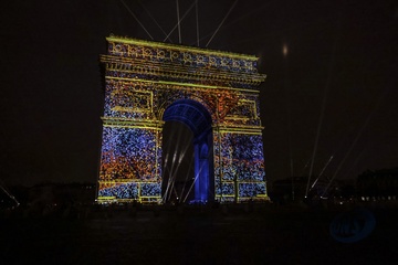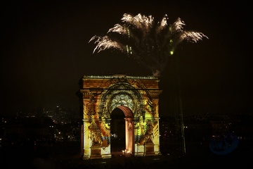 Show avec feu d’artifice, son, lumière projeté sur l'Arc de triomphe lors de l’émission "La grande soirée du 31 décembre de Paris" diffusée sur France 2 sur les Champs-Elysées à Paris
