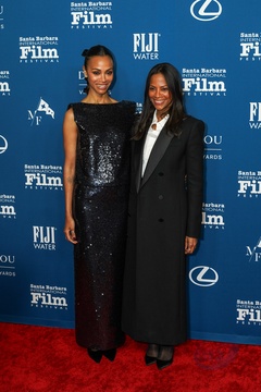 Zoe Saldana was honored with the American Riviera Award at the 40th Annual Santa Barbara International Film Festival. Zoe poses on the red carpet with her sister Cisely Saldana.