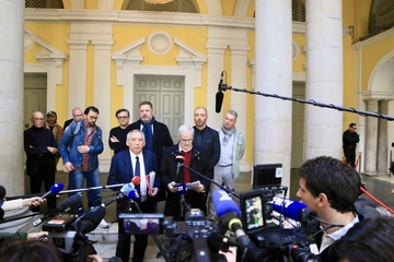 Le Premier ministre français François Bayrou et Alain Esquerre en conférence de presse après une réunion avec des membres du collectif des victimes des violences de Notre-Dame-de-Bétharram à l'hôtel de ville de Pau 18