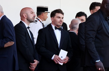 Antoine Dupont i jego partnerka Iris Mittenaere spotykają się na schodach planu zdjęciowego filmu „Dossier 137” podczas 78. Międzynarodowego Festiwalu Filmowego w Cannes. 46