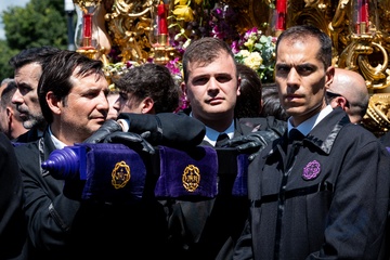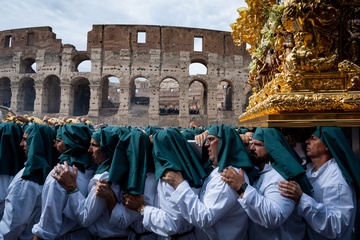 Confraternity members march in a procession through downtown Rome, near the Colosseum, during the Jubilee of Confraternities in Rome, Italy, on 17 May 2025. 35