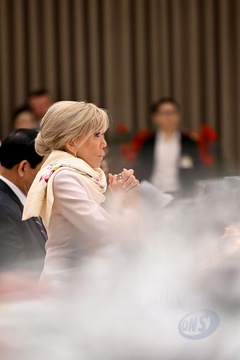 Prezydent Francji Emmanuel Macron i jego żona Brigitte Macron oraz jego wietnamski odpowiednik Luong Cuong i jego żona Nguyen Thi Minh Nguyet podczas oficjalnej kolacji w Hanoi International Convention Center. 82