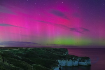 Northern Lights also know as the Aurora Borealis shines over Bempton Cliffs