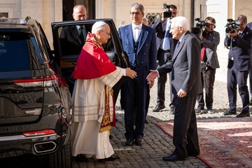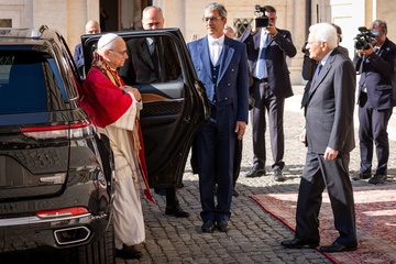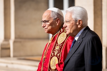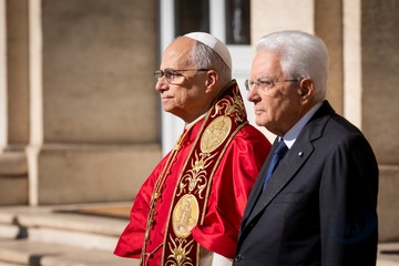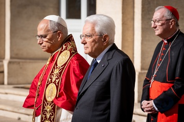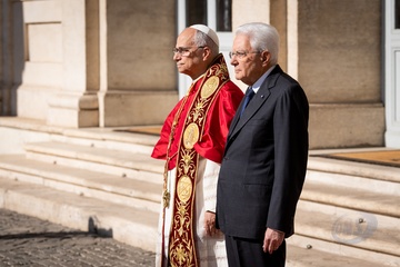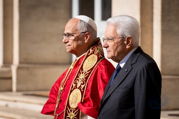 Pope Leo XIV is welcomed by Italian President Sergio Mattarella as he arrives at the Quirinale Presidential Palace in Rome, Italy, on 14 October, 2025. 27